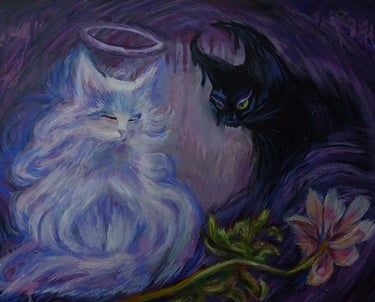 Pintura acrílica en desarrollo que explora la dualidad emocional. Representa la motivación y la inseguridad a través de dos gatos opuestos. Mediante el color y la composición busco expresar la tensión entre la calma y el caos, experimentando con contrastes de luz, textura y expresión para reflejar equilibrio y conflicto interior.